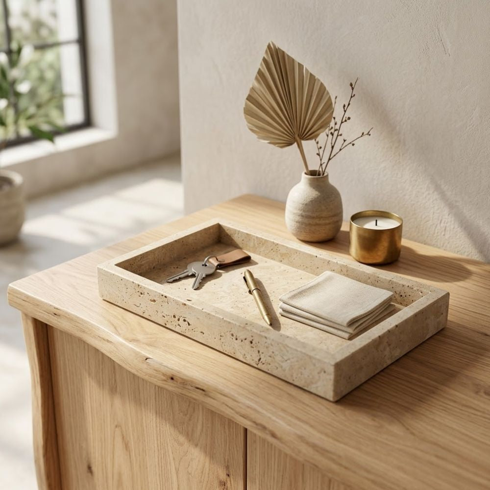 Bestellen Sie noch heute Ihr Travertin-Tablett und erleben Sie den luxuriösen Charme des handgefertigten Natursteindekors von Mediyera.