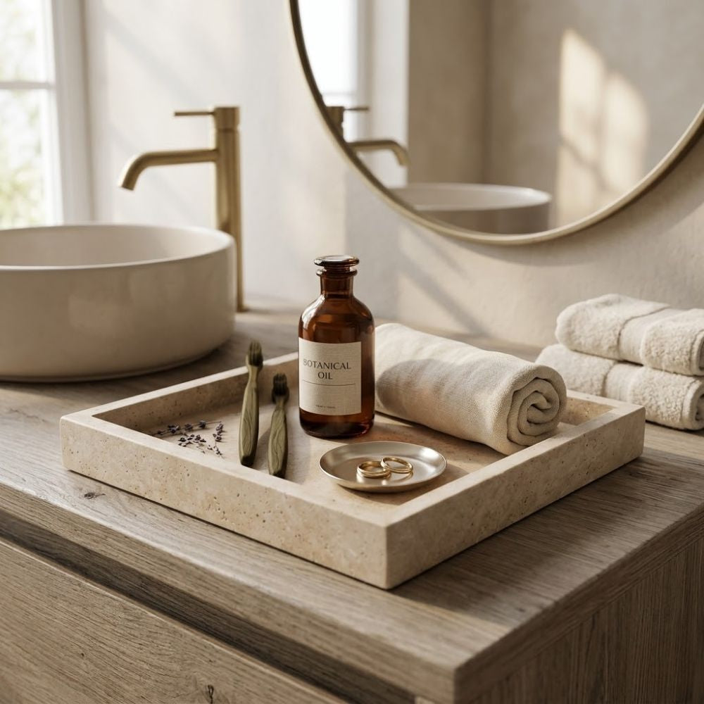 Bestellen Sie noch heute Ihr Travertin-Tablett und erleben Sie den zeitlosen Charme des handgefertigten Natursteindekors von Mediyera.